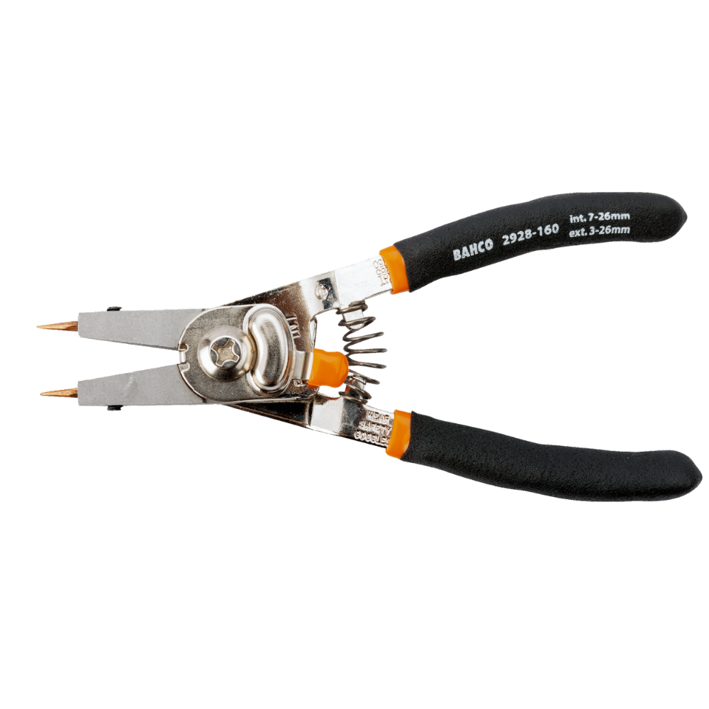 - Alicates patentados, equipados con puntas intercambiables (recta, 15º y 90º) fácilmente ajustables para usar con arandelas interiores o exteriores
