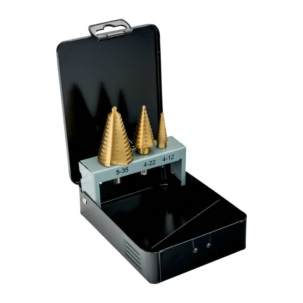 • Juego de brocas escalonadas para taladrar agujeros en láminas de metal finas