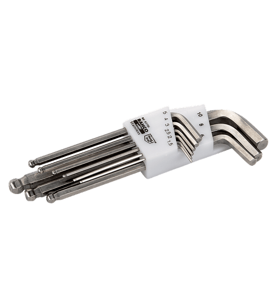 Este juego incluye 9 llaves acodadas con bola de medidas 1,5, 2, 2,5, 3, 4, 5, 6, 8 y 10mm. Las llaves están fabricadas con acero de alta calidad, totalmente templado, lo que les confiere una gran resistencia y durabilidad.