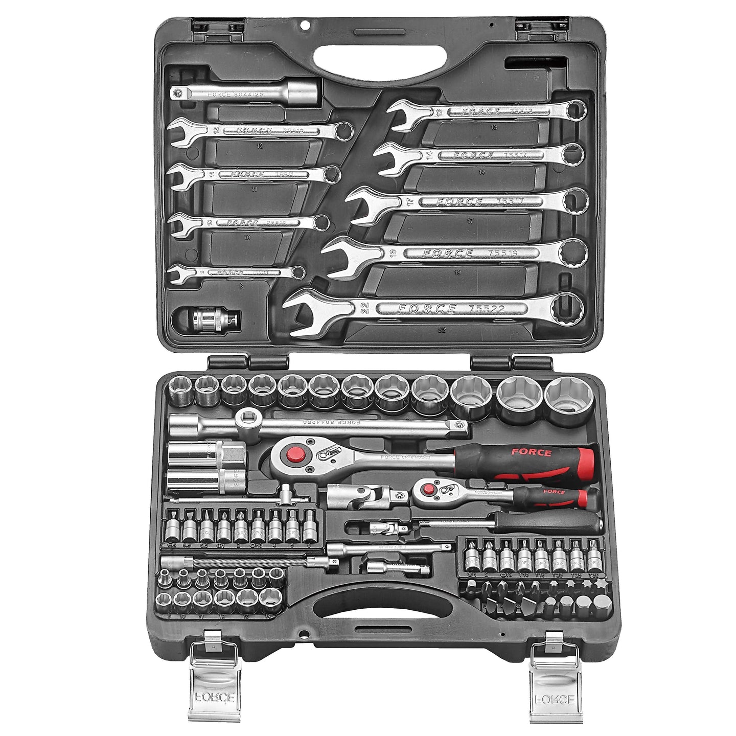 juego dados hexag. c/r, 13 dados []1/4" 4-14 mm. y 12 dados []1/2" de 14-32 mm., 17 dados y 15 puntas allen, torx, imbus y destornillador, accs. completos de []1/4" y []1/2" 9 llaves punta corona de 8 a 22 mm., caja plastica