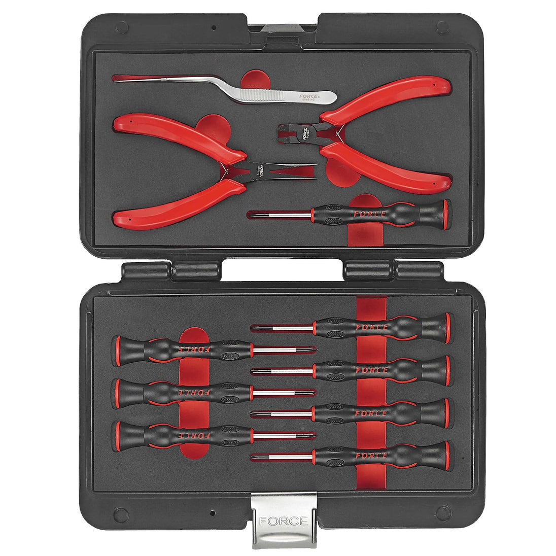 jgo. de destornilladores y alicates de precision, 5 destornilladores planos y 3 cruz, alicates cortante y de punta, y pinza, en caja plastica