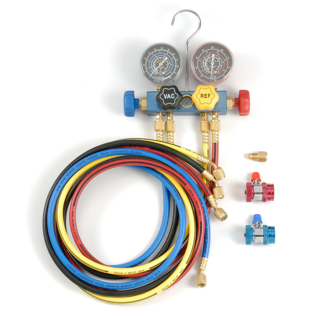 conjunto mano-reductor 4 vias p/r134a, auto a/c, manguera de 60" x 1/4" sae