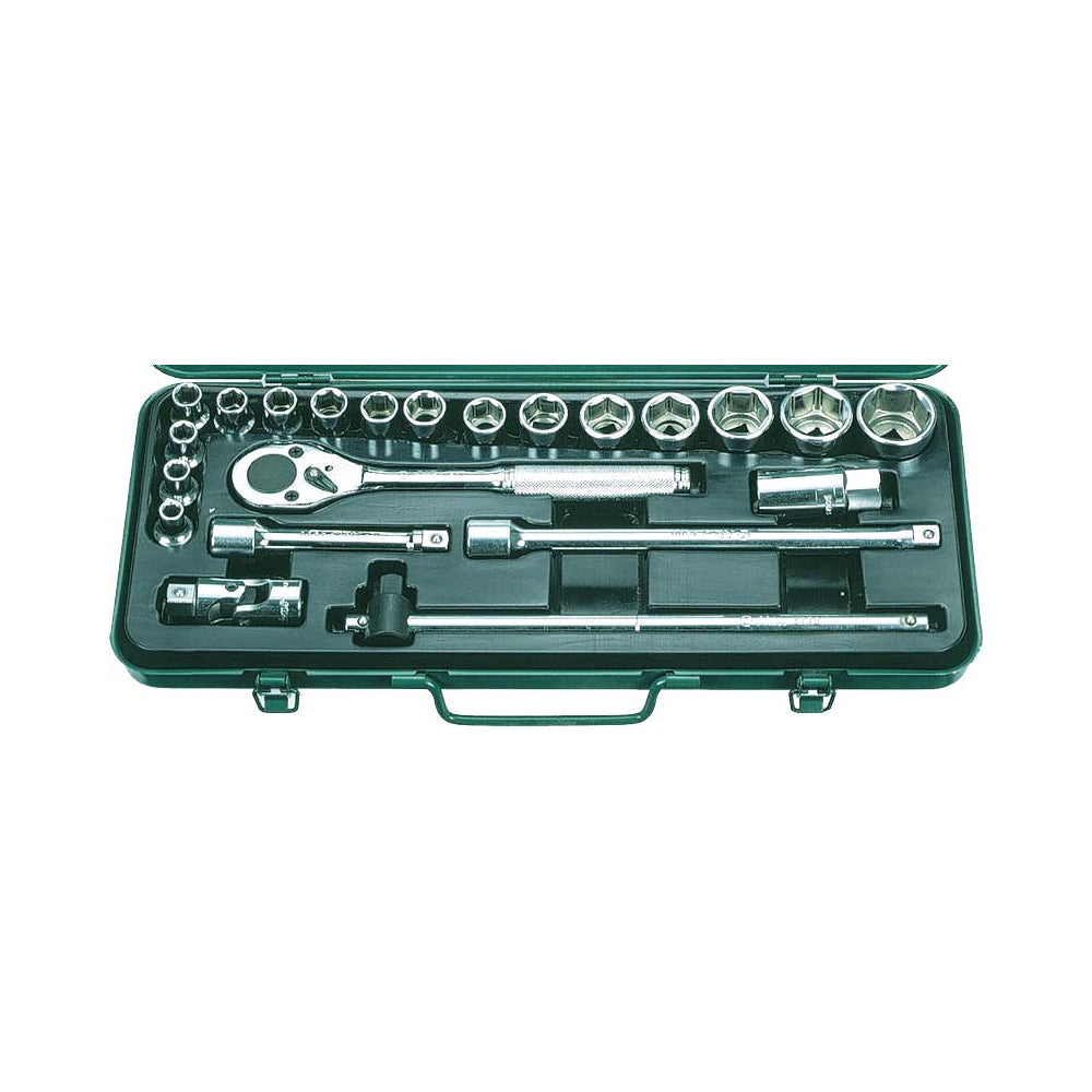 Dado SH (16pzs): 8 - 9 - 10 - 11 - 12 - 13 - 14 - 15 - 16 - 1 7 - 19 - 21 - 23 - 26 - 29 - 32 mm Chicharra Nº 4120N 10" Articulación universal Nº 4200 - 2.3/4" Mango corredizo Nº 4770 - 12" Extensión Nº 4800 - 5" y 10" Llave bujia Nº 4305 Caja metálica 440x185x50 mm