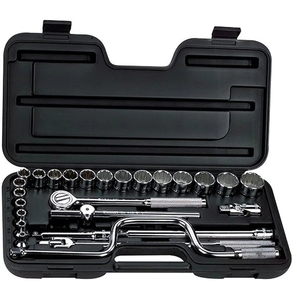 juego de dados []1/2" de 27 piezas, chicharra, extensiones de 5"-10", 2 mangos, berbiqui, junta y dados de 1/4" a 1.1/4"