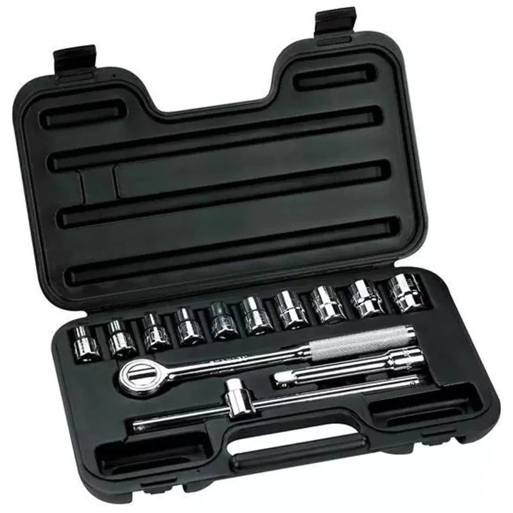 juego de dados []1/2" de 14 piezas, chicharra, extension 5", b.corredizo, 10 dados de 3/8" a 1" y caja metalica