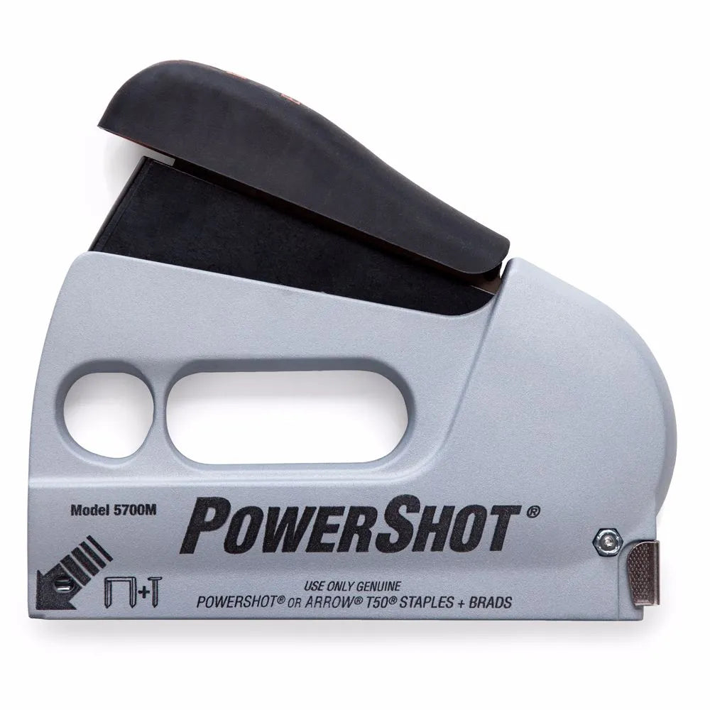 la powershot 5700 reconocible al instante es la pistola de acción frontal y clavadora brad más vendida de estados unidos. su diseño ergonómico patentado permite al operador empujar contra el mango en lugar de apretar, ofreciendo un rendimiento fácil y consistente y una alta precisión. el 5700 también cuenta con un robusto cuerpo de aluminio fundido a presión, un cargador de carga trasero clásico y una ventana de visualización básica para indicar cuándo las grapas se están agotando.