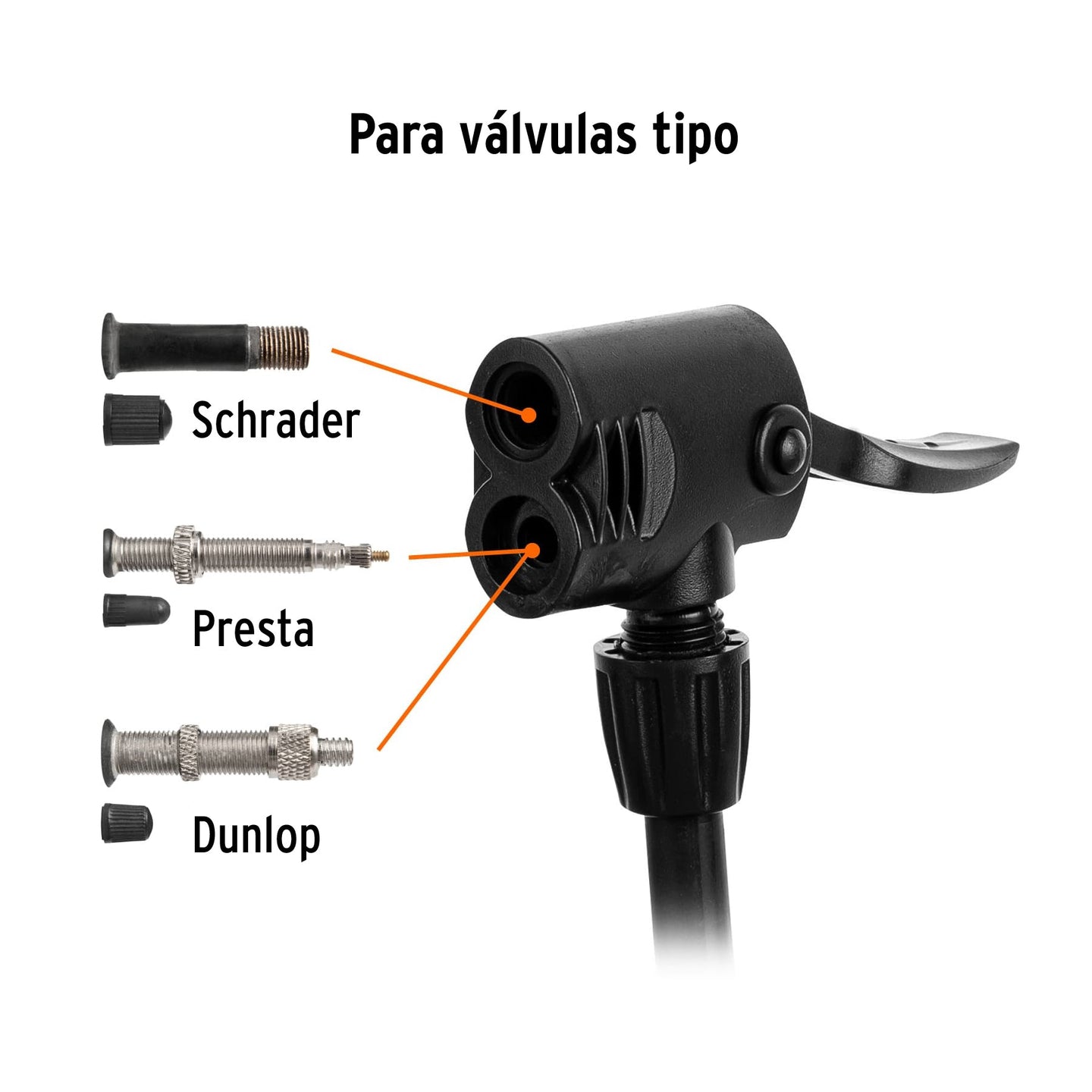 - Cabeza dual que permite el uso de válvulas europea (Presta), americana (Schrader) e inglesa (Dunlop). No estan incluidas