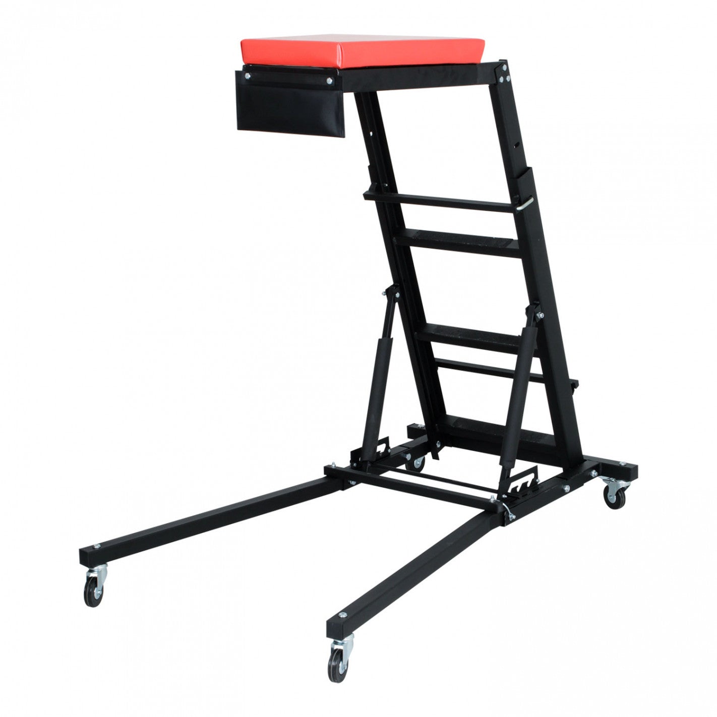 Camilla de mecánico para capó con altura regulable 1220 a 1778 mm Camilla de mecánico para capot, sirve como punto de apoyo y alcance fácil del compartimento superior del motor para trabajos mecánicos aportando alta comodidad y reduciendo notablemente el agotamiento en espalda, piernas y rodillas del operario mientras realiza trabajos sobre el capot. Destacada por su alta funcionalidad compatible para diferentes tipos de vehículos (turismos, todoterrenos, vehículos comerciales...), gracias a su regulación de altura que permite trabajar en diversas posiciones de forma más productiva, cómoda y segura.  Parte superior con plataforma acolchada para que el mecánico descanse y se apoye de forma confortable mientras llega a la zona de trabajo.