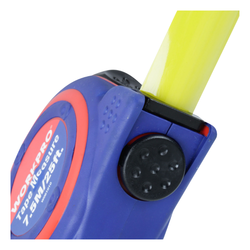 Huincha de medir de 7,5 m con cubierta de goma utiliza material bimaterial. Incluye autobloqueo para extensión fluida, botón de pulgar práctico y carcasa ergonómica para manejo cómodo.