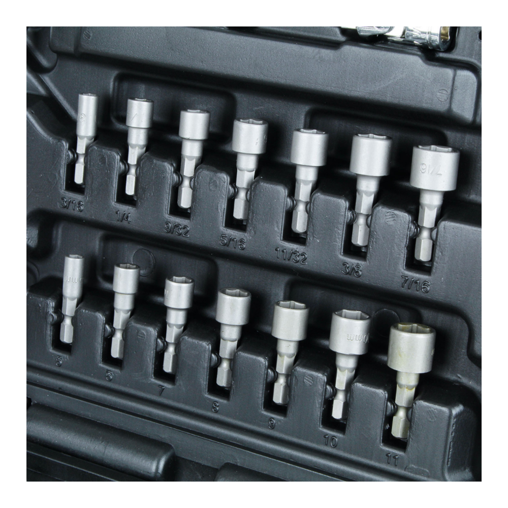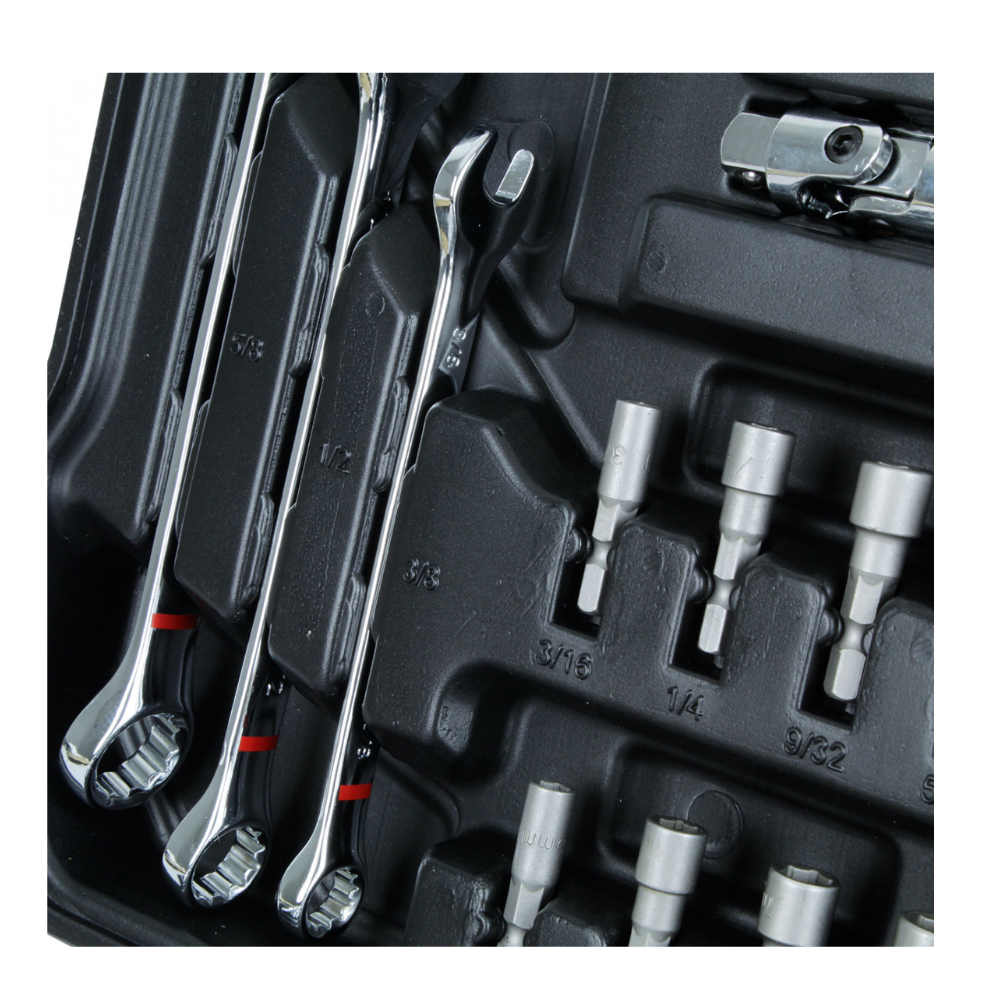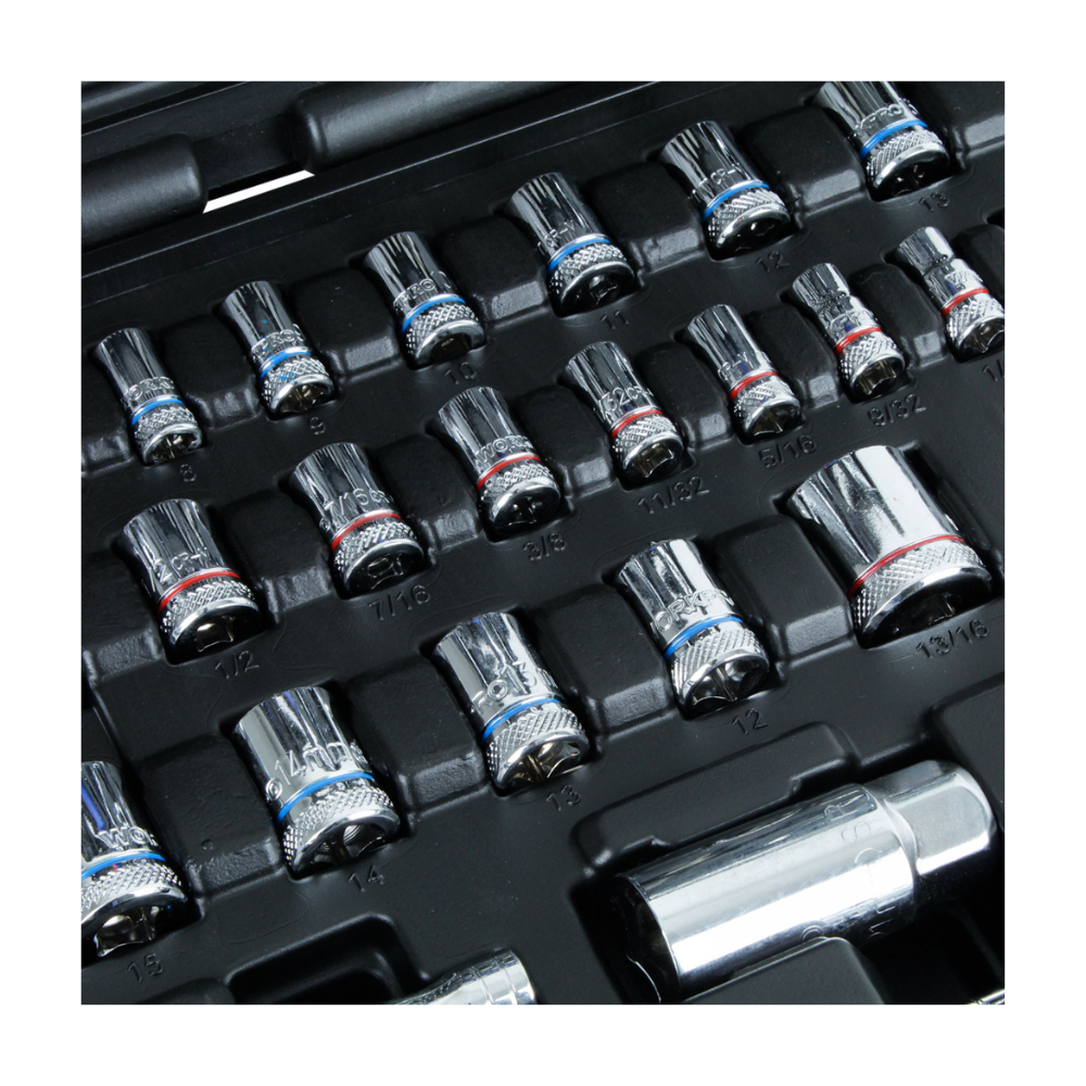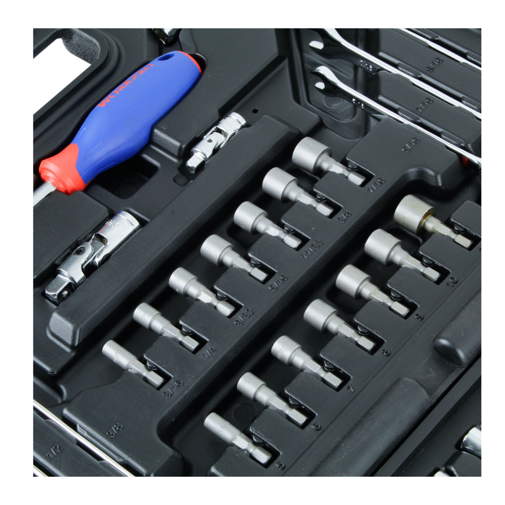 Maletín de 101 herramientas con llaves y dados incluye una amplia selección de tomas SAE y métricas para 1/4" y 3/8", barras de extensión, chicharras quick release, juntas universales, llaves punta corona, soporte magnético, puntas, adaptador y llaves hexagonales en SAE y métrica, todo en un maletín para portabilidad.