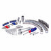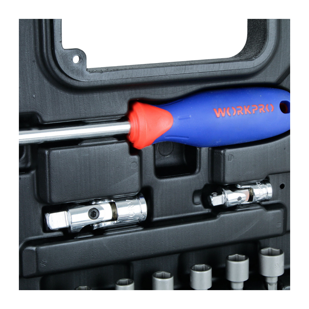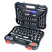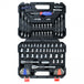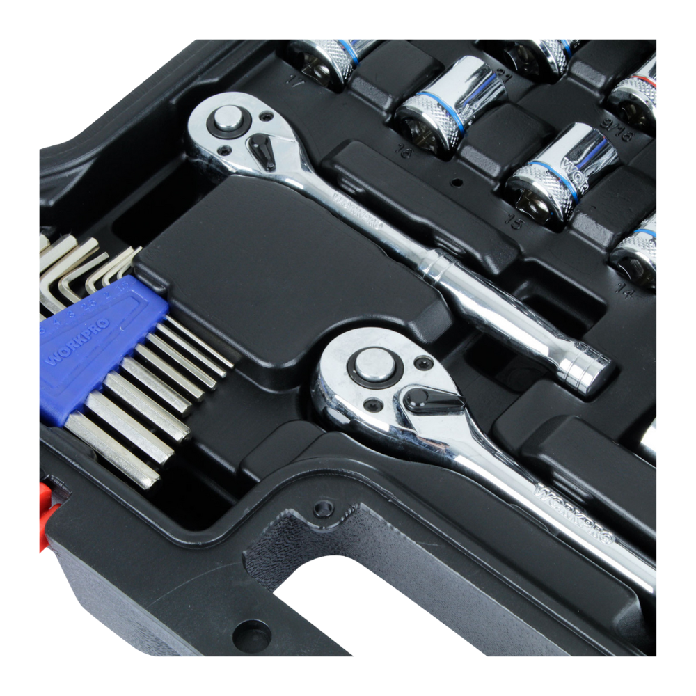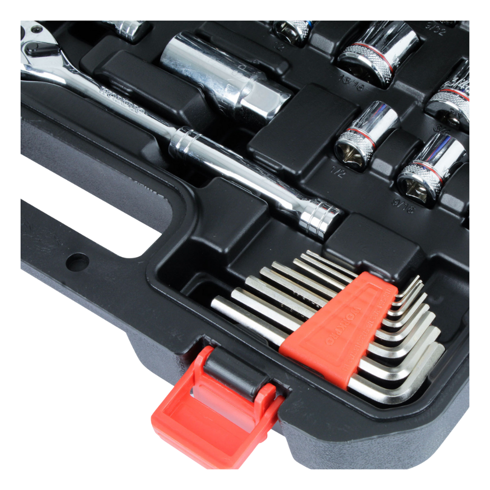 Maletín de 101 herramientas con llaves y dados incluye una amplia selección de tomas SAE y métricas para 1/4" y 3/8", barras de extensión, chicharras quick release, juntas universales, llaves punta corona, soporte magnético, puntas, adaptador y llaves hexagonales en SAE y métrica, todo en un maletín para portabilidad.