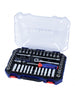 Juego de 70 dados para 1/4" abarca tomas SAE y métricas estándar y profundas, articulación universal, nut drivers, coupler, barras de extensión, chicharra de liberación rápida, spinner handle y 20 bits con holder para un kit completo.