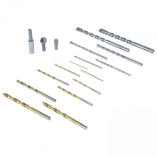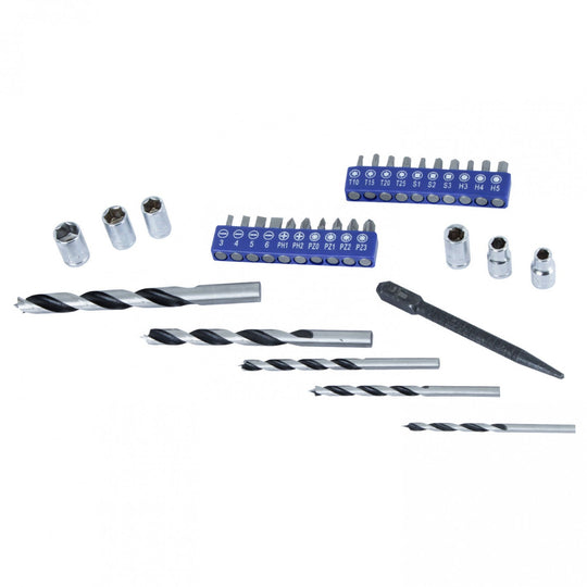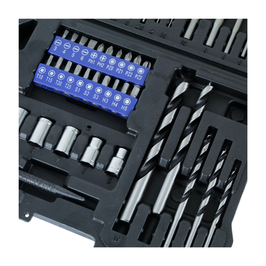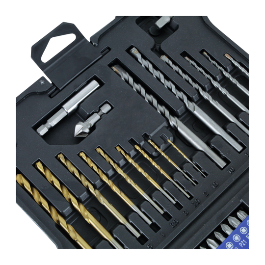 Este set de 51 brocas para taladro WORKPRO contiene 9 brocas helicoidales HSS, 6 para mampostería, 5 diseñadas para madera, además de un punzón central, avellanador, soporte magnético y 20 puntas para destornillador (planas, Phillips, Pozi,...Precio regular $13.490