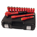 El juego incluye: enchufes de 8,0, 9,0, 10,0, 11,0, 12,0, 13,0, 14,0, 17,0, 19,0, 22,0 y 24,0 mm | Barra de extensión de 125 mm | Barra de extensión de 250 mm | Trinquete con accionamiento de 1/2"