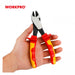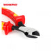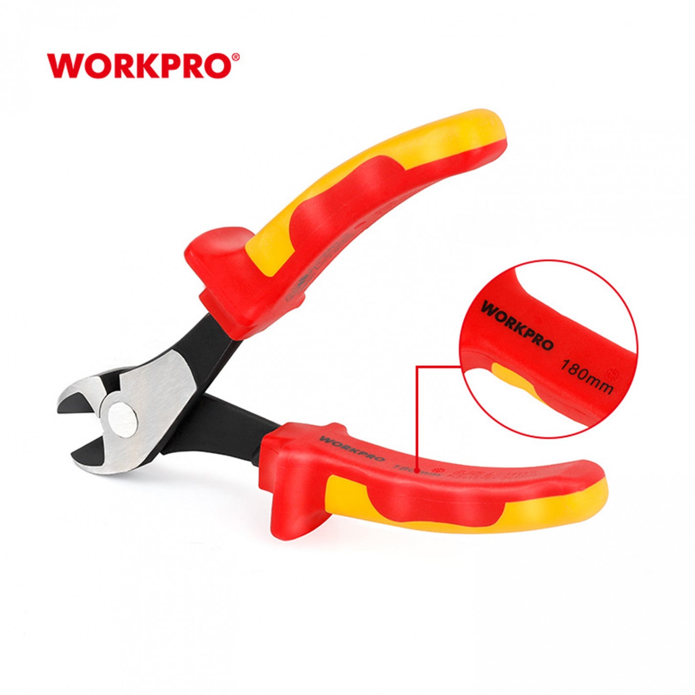 ALICATE DE CORTE DIAGONAL AISLADO 7" diseñado conforme a la norma EN/IEC 60900. Cada unidad se prueba individualmente a 10 000 V CA y está certificada para trabajos hasta 1000 V CA. Cuenta con mangos ergonómicos de doble material que ofrecen un agarre seguro y confortable. Requiere un 20 % menos de fuerza que los cortadores diagonales convencionales. Sus filos, templados por inducción para mayor precisión, son aptos para cortar todo tipo de alambres, incluyendo cuerdas de piano, con una dureza aproximada de 45 HRC.