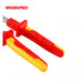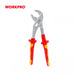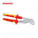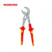 ALICATE PICOLORO AJUSTABLE AISLADO 10", fabricado conforme a la norma EN/IEC 60900. Cada unidad es examinada individualmente con una prueba a 10.000 V CA y certificada para trabajos bajo 1.000 V CA. Cuenta con mangos ergonómicos de doble material que proporcionan un agarre confortable. El ajuste se realiza desplazando una mordaza directamente sobre la pieza, con regulación precisa para diversas dimensiones y una postura cómoda de la mano. Sus superficies de contacto incluyen dientes endurecidos especiales con una dureza cercana a 50 HRC para un agarre seguro.