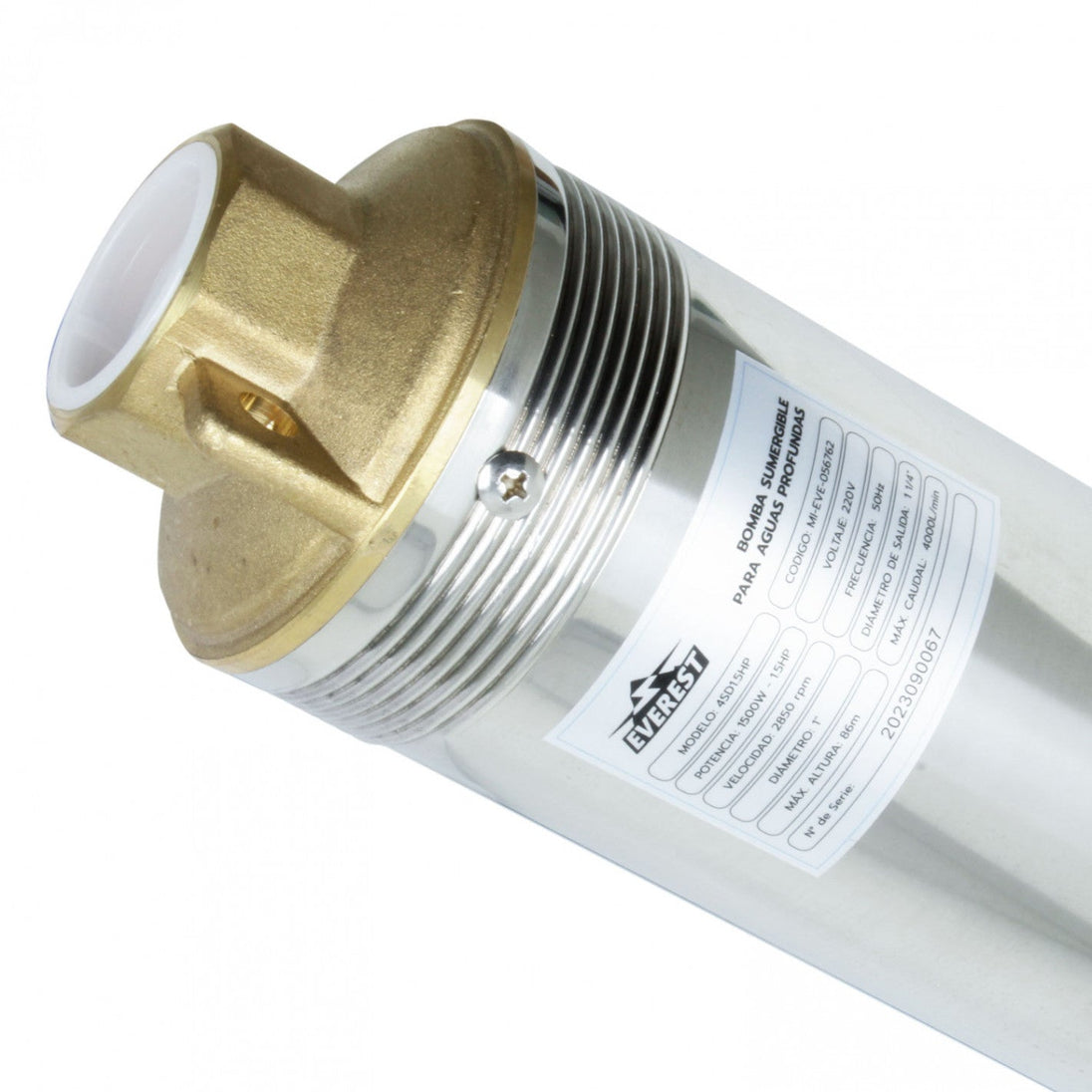 Bomba sumergible para pozo profundo de 1.5HP con diseño multietapa. Ofrece bajo consumo de amperaje, operación silenciosa y sistema de refrigeración eficiente. No requiere uso de inductor de flujo.