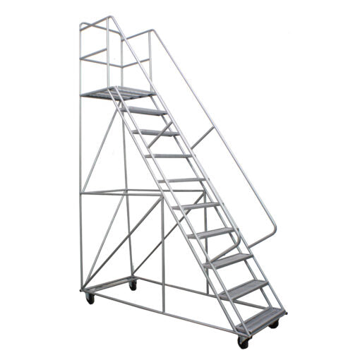 Escalera de Acero, con 4 ruedas de gran calidad, 2 fijas y 2 giratorias con freno para mayor seguridad. Ideal para trabajos en altura, cuenta con barandal de apoyo y peldaños de malla antideslizantes.