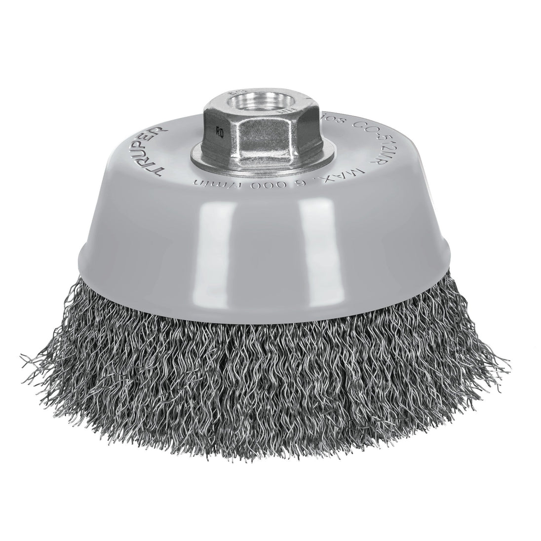 La escobilla 5/8 14mm Copa Alambre Ondulado Fino 5'' Truper 100859 es una herramienta esencial para el trabajo en metal. Diseñada para esmeriladoras de 7" y 9", su entrada multirosca de 5/8" y 14 mm la hace compatible con diversas marcas, brindando versatilidad en su uso. Fabricada en acero al carbono, ofrece un acabado fino que garantiza un rendimiento óptimo en la limpieza de superficies irregulares, eliminación de óxido y rebabas. Con un diámetro de 5" y un espesor de 7/8", esta carda puede alcanzar velocidades de hasta 6,000 rpm, lo que la convierte en una opción eficiente para trabajos de desbaste. Su largo de alambre de 35 mm y calibre de 0.3 mm (0.012") aseguran un acabado preciso y duradero. Ideal para profesionales y aficionados, este cepillo de acero es una herramienta nueva y sin vencimiento, perfecta para mantener tus proyectos en metal en excelente estado.