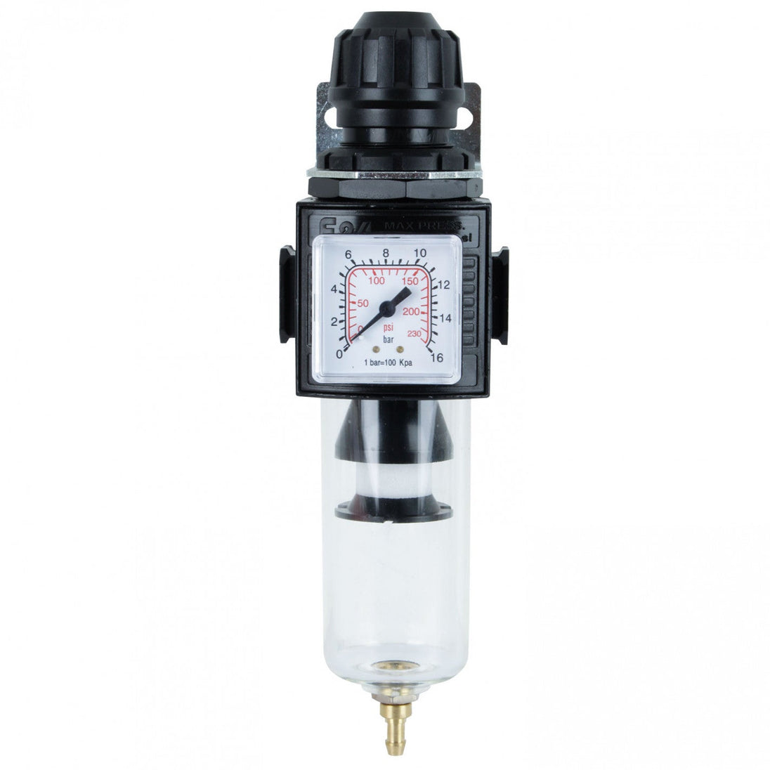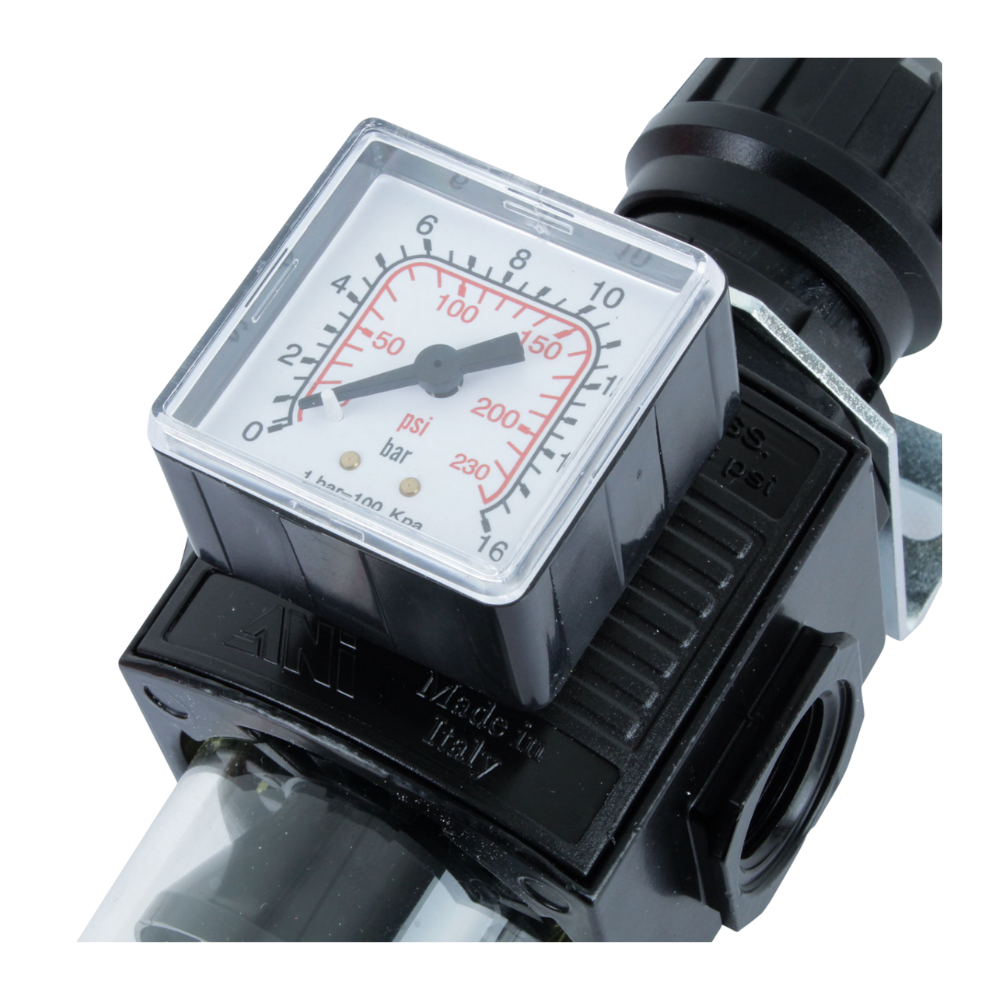 Filtro regulador de aire anti humedad, polvo, aceite, para compresor con entrada de 1/2”. Evita el escupido de agua de tu pistola, a una presión como máximo de 16 bares, por el cual es importante su regulación de presión de aire comprimido para el uso de pistolas.