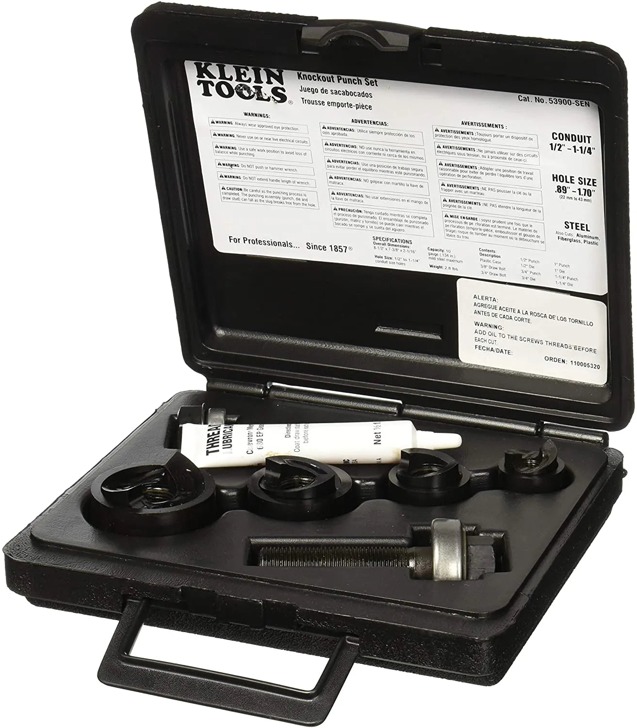 juego de 4 sacabocados para conduits de 1/2" - 3/4" - 1" - 1.1/4", tornillos de 3/8" y 3/4" c/rodamientos, c/plastica