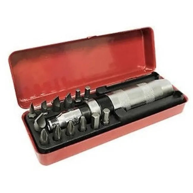 juego destornilladores de golpe de 14 pzs: mango, 5 puntas planas, 4 cruz y 4 allen, estuche metalico.