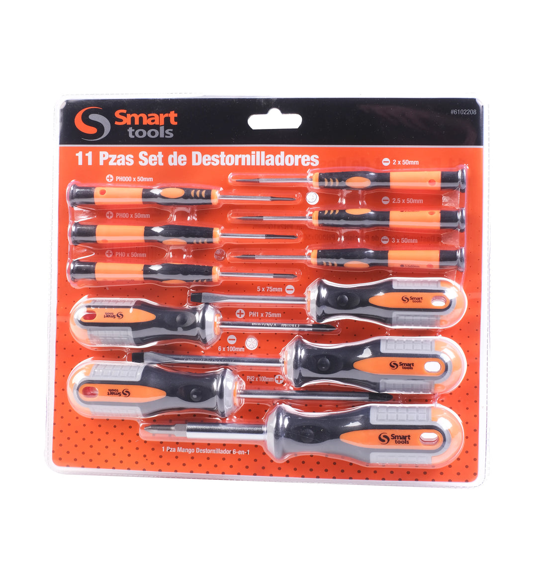 set de destornilladores 11 piezas crv, medidas : planos 5x75mm,6x100mm , phillips ph1x75,ph2x100, precision planos 2x50mm,2.5x50mm,3x50mm phillips ph000x50,ph00x50,ph0x50