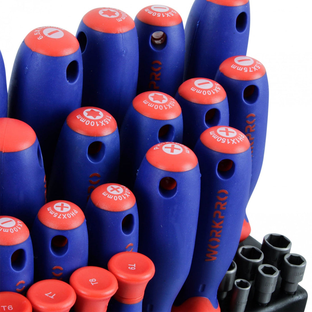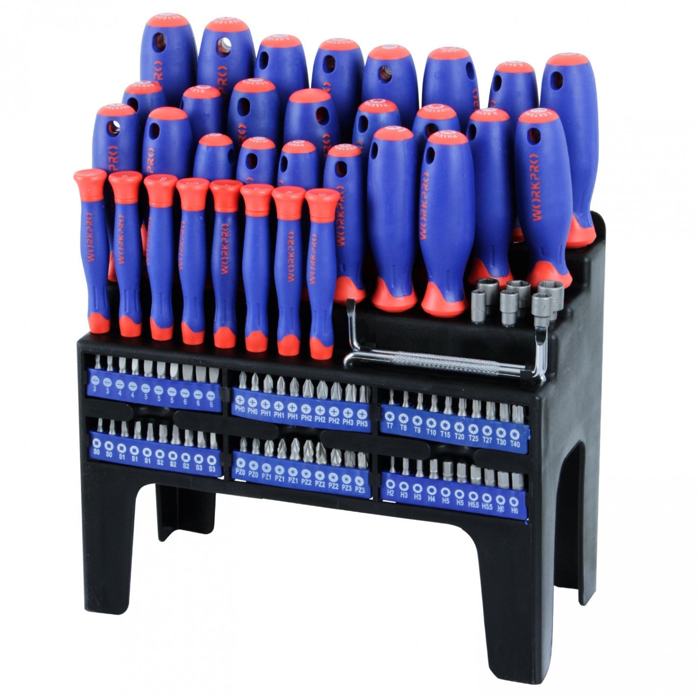 Este set de destornilladores y puntas WORKPRO incluye 100 piezas fabricadas con hoja de cromo-vanadio para mayor durabilidad. Contiene un destornillador de precisión con 8 puntas variadas, un soporte magnético para puntas y un juego de 60 brocas. Además, incluye 22 destornilladores de diferentes tamaños y tipos, un punzón de 100 mm, 2 puntas Z combinadas y un juego de 6 dados (medidas 5 a 10 mm), ofreciendo una solución completa para trabajos exigentes y variados.