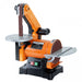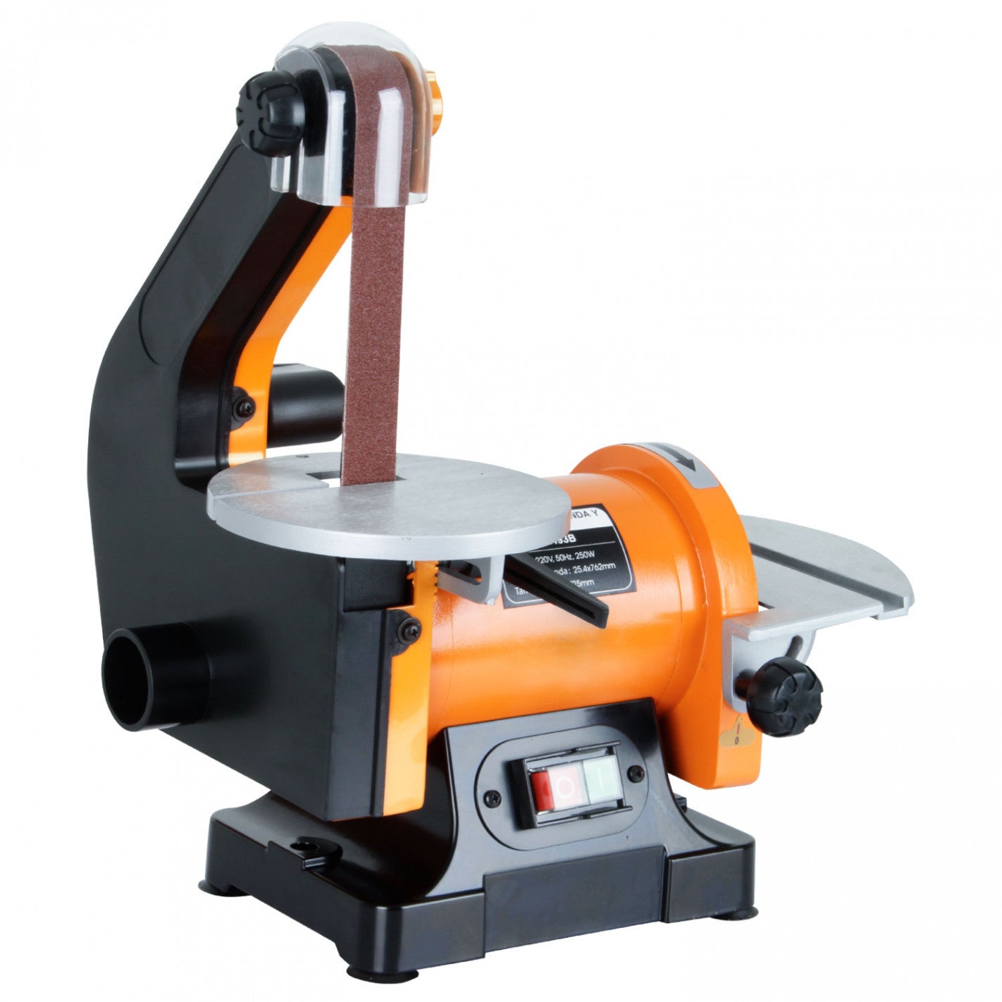 LIJADORA DE BANDA Y DISCO 5" - 1*30" 250W cuenta con un motor de inducción sellado que garantiza un rendimiento eficiente, silencioso y duradero. Su base de aluminio fundido proporciona una estabilidad superior durante el uso, permitiendo aplicar la presión necesaria para conseguir acabados uniformes. Además, incluye una banda de lija con sistema de seguimiento rápido y una guía de ingletes para trabajos precisos.