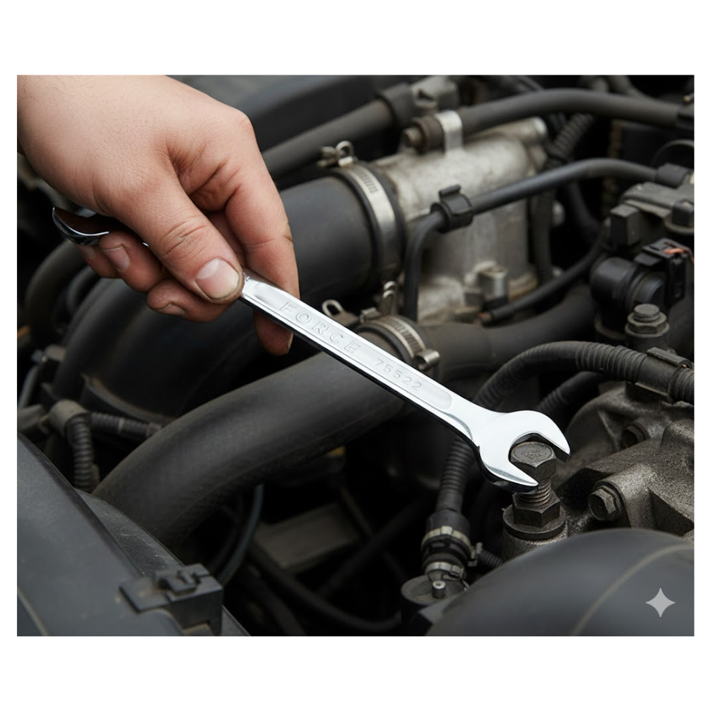 Llave combinada Punta Corona de 10 mm. Force, para uso en Taller Mecánico, sector Industrial, mantención; para aflojar o fijar tuercas y/o pernos para trabajos de uso rudo, construidas en Cromo Vanadio con nuevo diseño ergonométrico y puntos reforzado en donde se ejerce mayor fuerza.