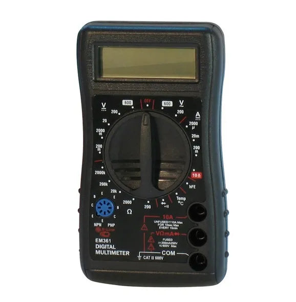 multitester digital de 8 funciones, con proteccion contra sobrecargas, ergonome- trico, mide dcv (200mv-1000v), acv (200 mv-750v), dca (200 microamp-10a), ohms 200 ohms-2 mega ohms), temperatura (0ºc- 1000ºc), chequeo de diodos, hfe.