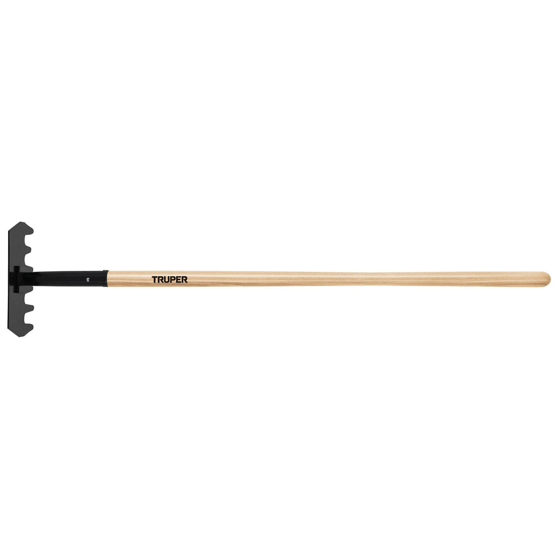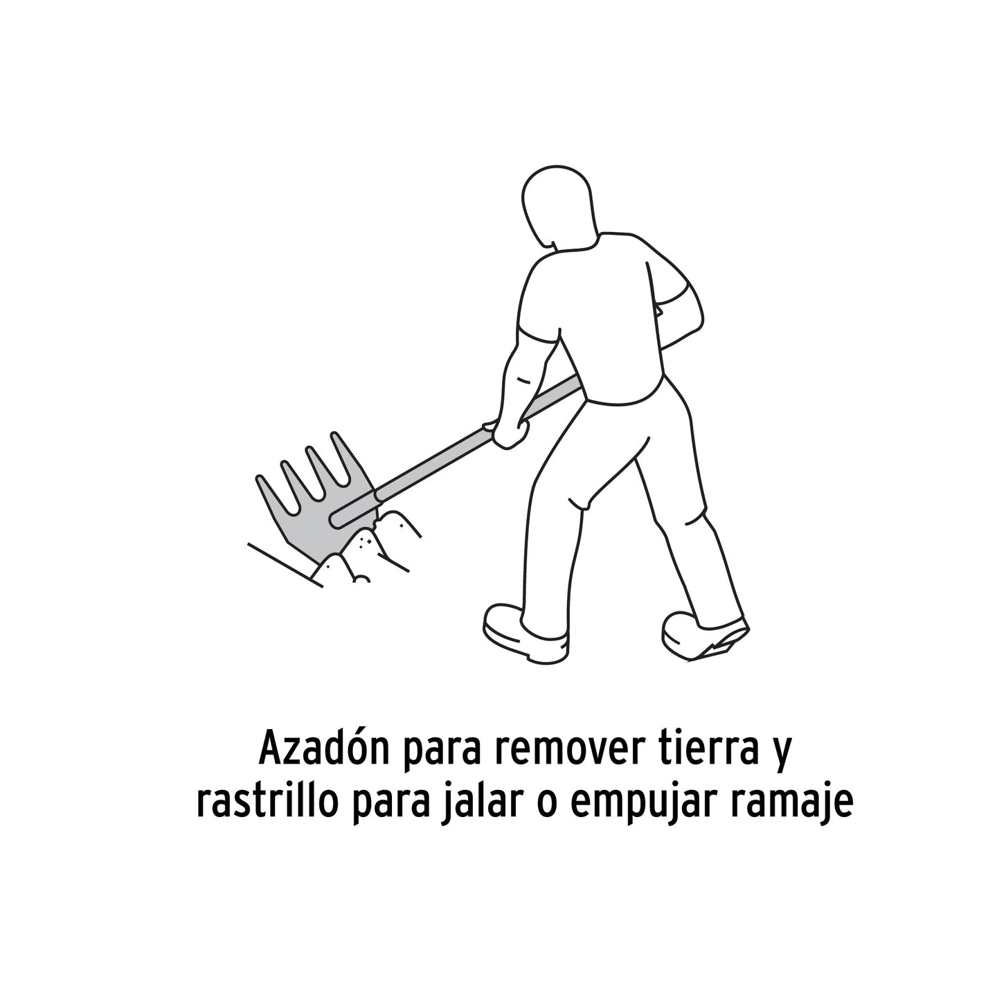 - Cabeza de acero con 2 herramientas en 1; azadón con filo templado para remover tierra y rastrillo para jalar o empujar ramaje