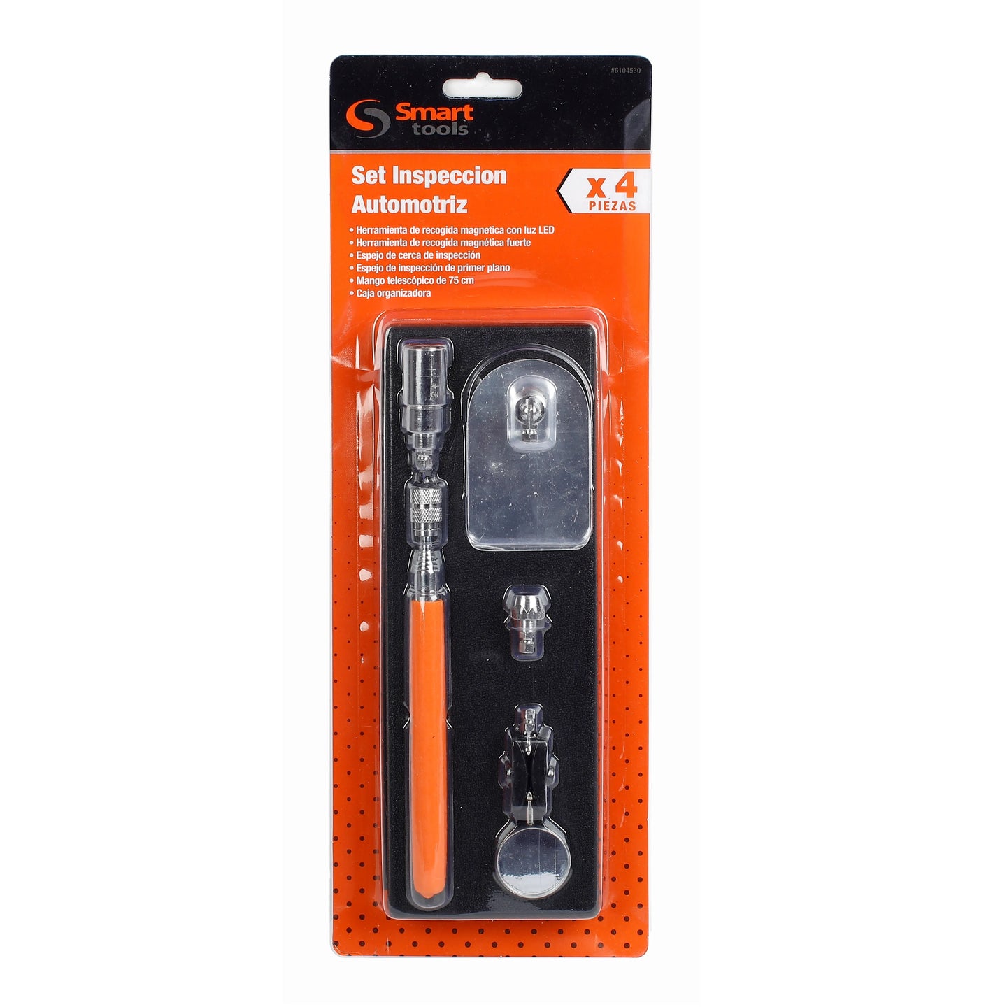 set de inspeccion x 4 piezas, incluye : herramienta de recogida magnetica con luz led, herramienta de recogida magnética fuerte, espejo de cerca de inspección, espejo de inspección de primer plano, mango telescópico de 75 cm, caja organizadora